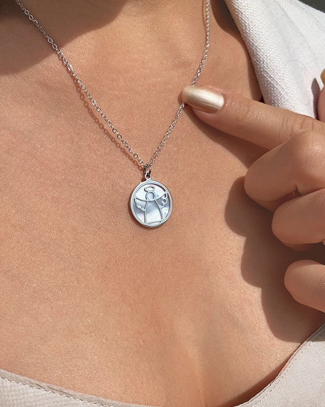 Dieses Schmuckstück präsentiert einen Engel. Es symbolisiert die Perfektion, die Güte sowie den göttlichen Schutz. Das mit Perlmutt verzierte Schmuckschild reflektiert perfekt die Sonnenstrahlen und lässt Ihren Ausschnitt strahlen.
