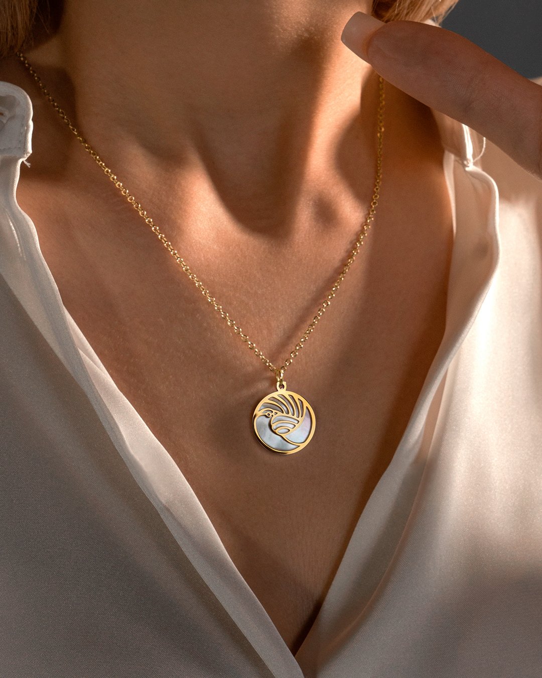 Der Anhänger Colombattio Doro besteht aus einem Perlmuttstück, das mit einem Motiv aus vergoldetem Edelstahl umhüllt ist.