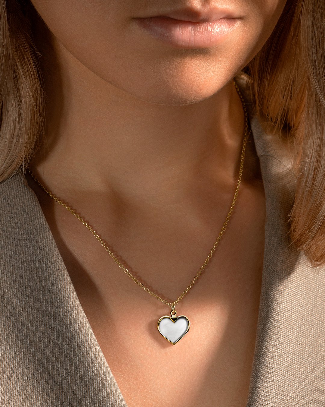 Der Anhänger Doro Cuorettio ist aus vergoldetem Edelstahl gefertigt und wird von einem perlmuttfarbenen Schmuckschild begleitet.