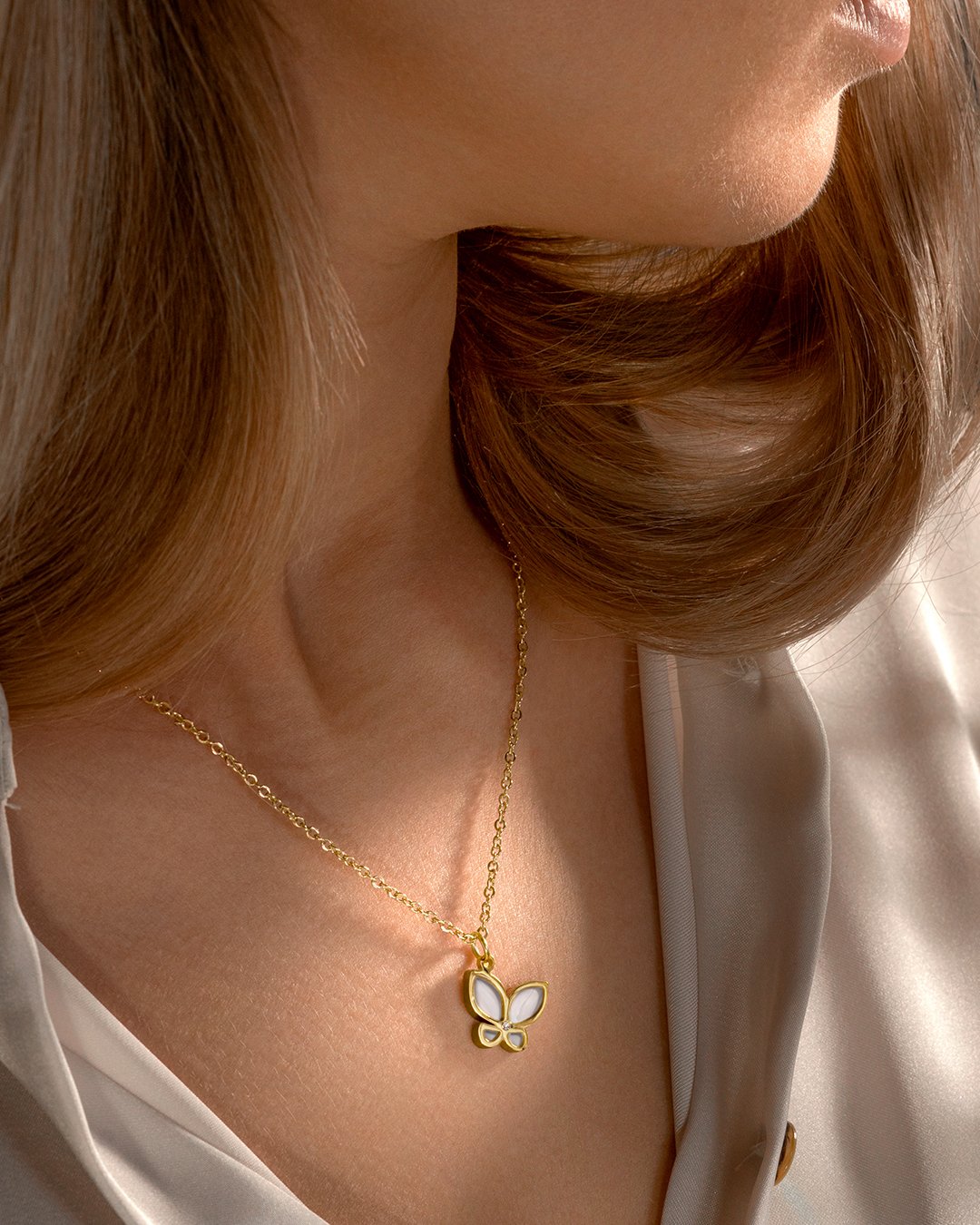 Der Anhänger Farfallattio Doro besteht aus vergoldetem Edelstahl und einem perlmuttfarbenen Schmuckschild mit Strasssteinen.