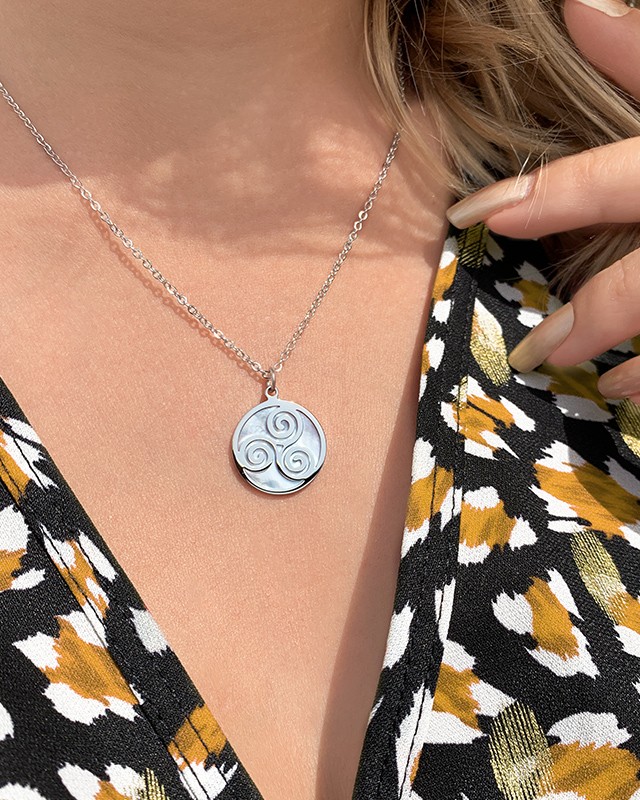 Der Anhänger Triskelino ist aus Edelstahl und mit einem Perlmutt verzierten Motiv versehen.