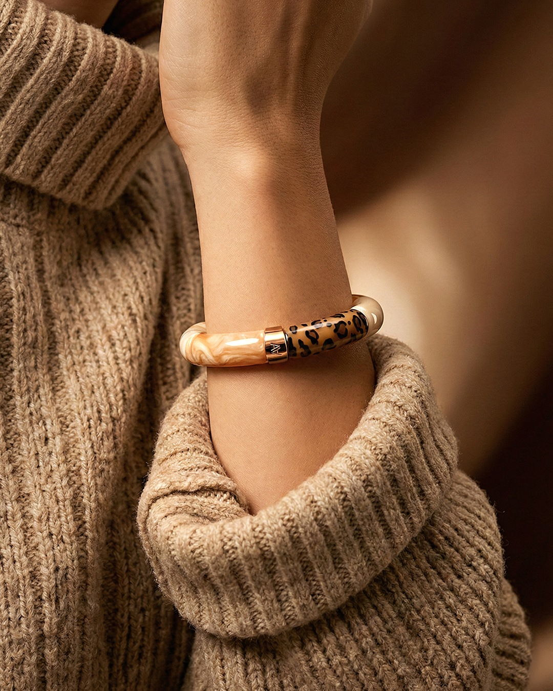 Lassen Sie sich von diesem handgefertigten Acetat-Armband verführen – Symbol für erschwinglichen Luxus und verantwortungsvolle Mode.