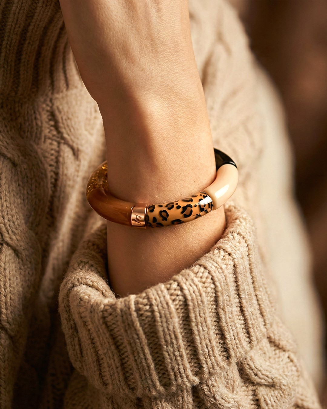 Das Armband besteht aus edlen Elementen in einer Farbe Braun, Gold glitzernd, Schwarz, Latte-Beige, Petrolbraun, Zweifarbiges Leopardenbraun.