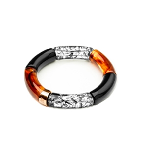 Das Armband besticht durch seine besondere Komposition: zwei Elemente aus rosévergoldetem Edelstahl, die Robustheit und Glanz verleihen, zwei Elemente aus tiefschwarzem Acetat, die eine intensive und geheimnisvolle Note setzen, sowie zwei Elemente aus transparentem Acetat mit schwarzen Einschlüssen, die für eine texturierte und geheimnisvolle Wirkung sorgen.