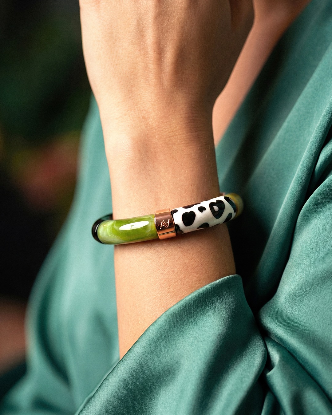 Das Armband besticht durch edle Elemente in satten Grüntönen.