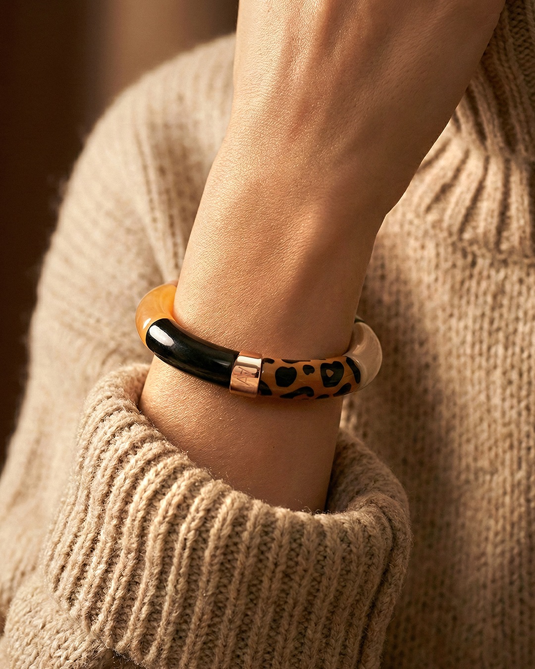 Lassen Sie sich von diesem handgefertigten Acetat-Armband verführen – Symbol für erschwinglichen Luxus und verantwortungsvolle Mode.