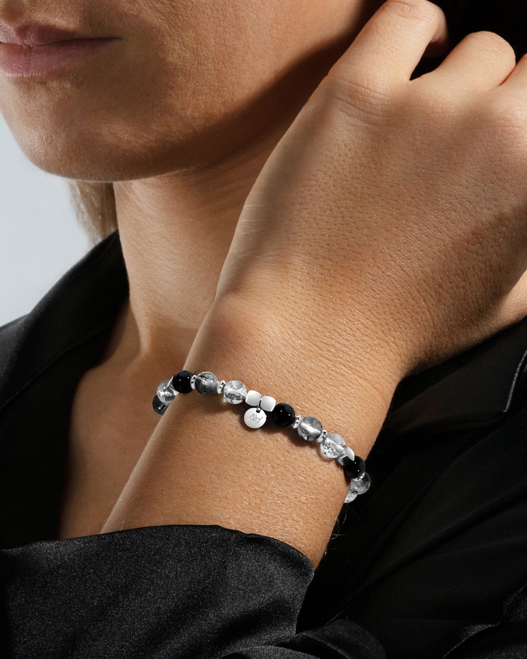 Eine zarte und dennoch kraftvolle Kombination aus Bergkristall, Rutilquarz und Onyx entfaltet ein Spektrum synergistischer Schwingungsenergien, deren Zweck darin besteht, den Träger durch beispiellose geistige Klarheit zu mehr Selbstvertrauen zu führen.