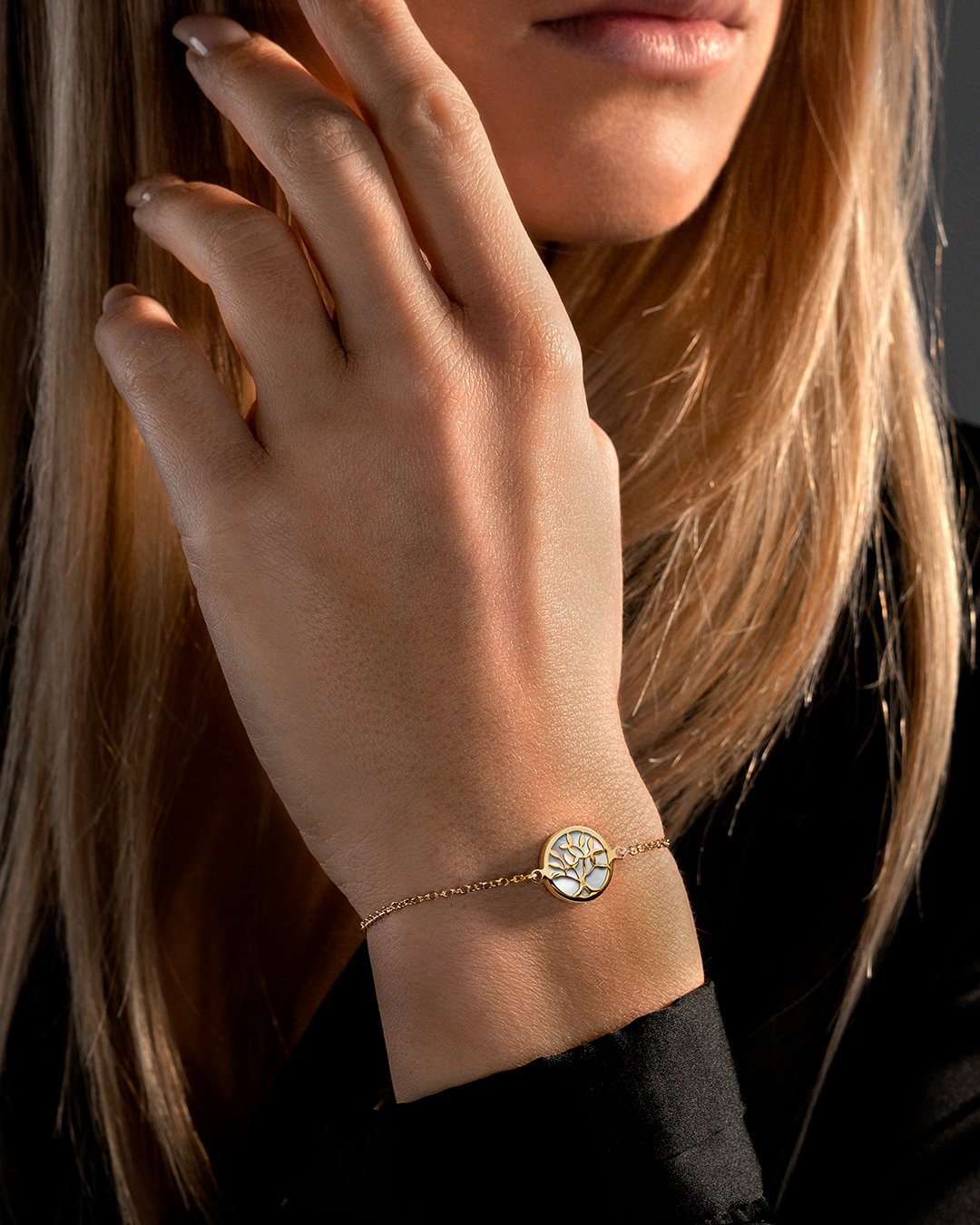 Das Armband Alberetti Doro besteht aus einem komplett mit Edelstahl besetzten und aus vergoldetem Edelstahl bestehenden Motiv.
