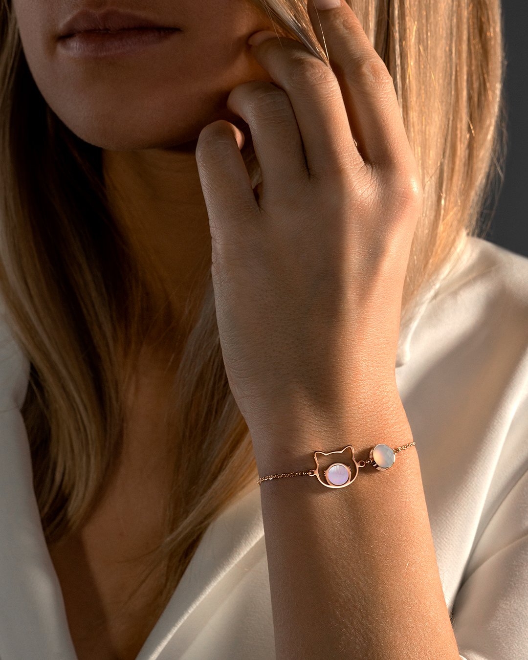 Das Armband Gattino Rosa aus roséfarbenem Edelstahl besteht aus einem katzenförmigen Element, das mit einem weißen Achat verziert ist.