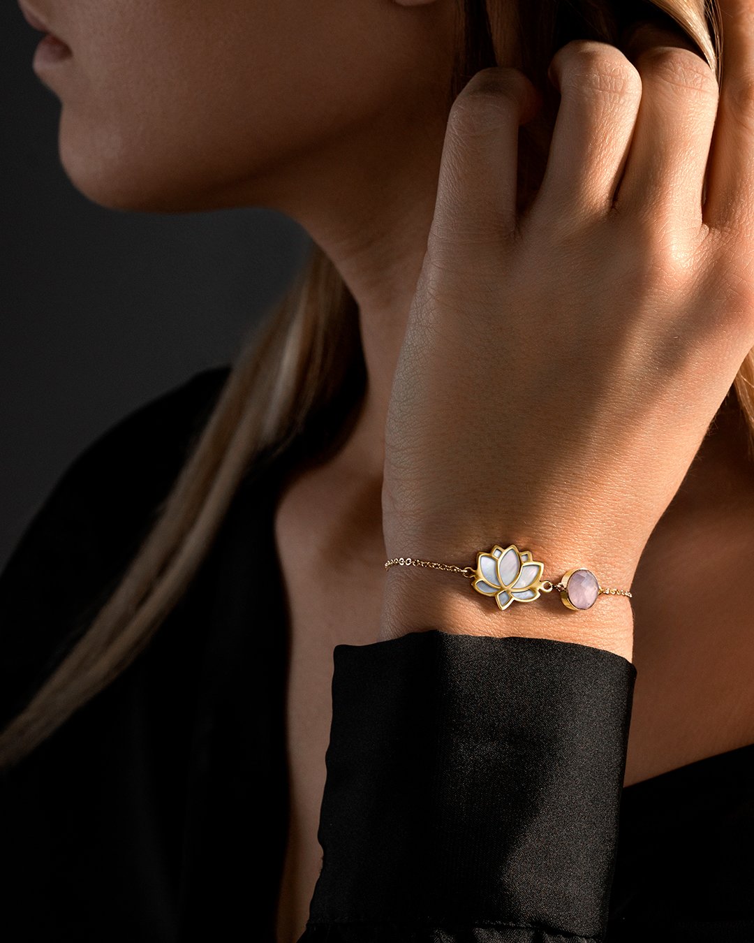 "Das Armband Lotino Doro aus vergoldetem Edelstahl besteht aus einem Perlmuttstück, das von einem Rosenquarz begleitet wird.
