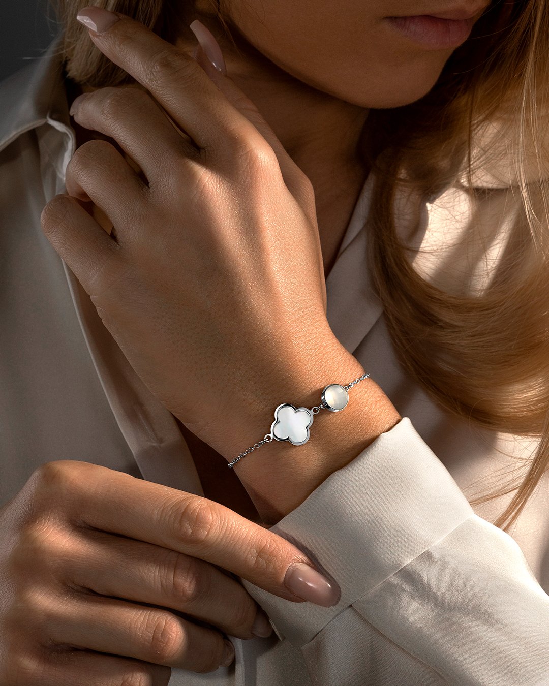 Das Armband Quadrifozzi aus Edelstahl besteht aus einem Perlmuttstück, das von einem weißen Achat begleitet wird.