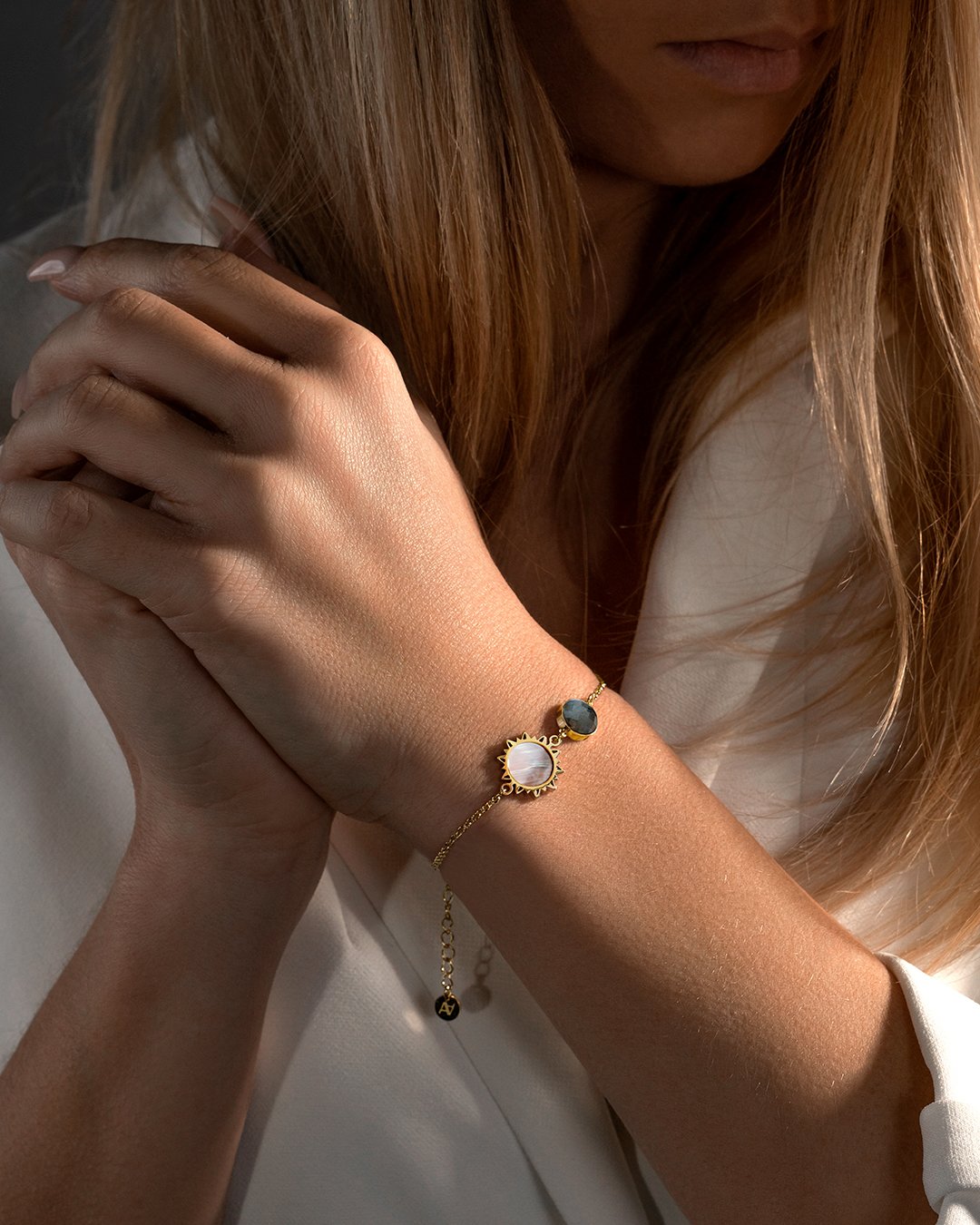 Das Armband Soletti aus vergoldetem Edelstahl besteht aus einem Perlmuttstück, das von einem Chalzedon begleitet wird.