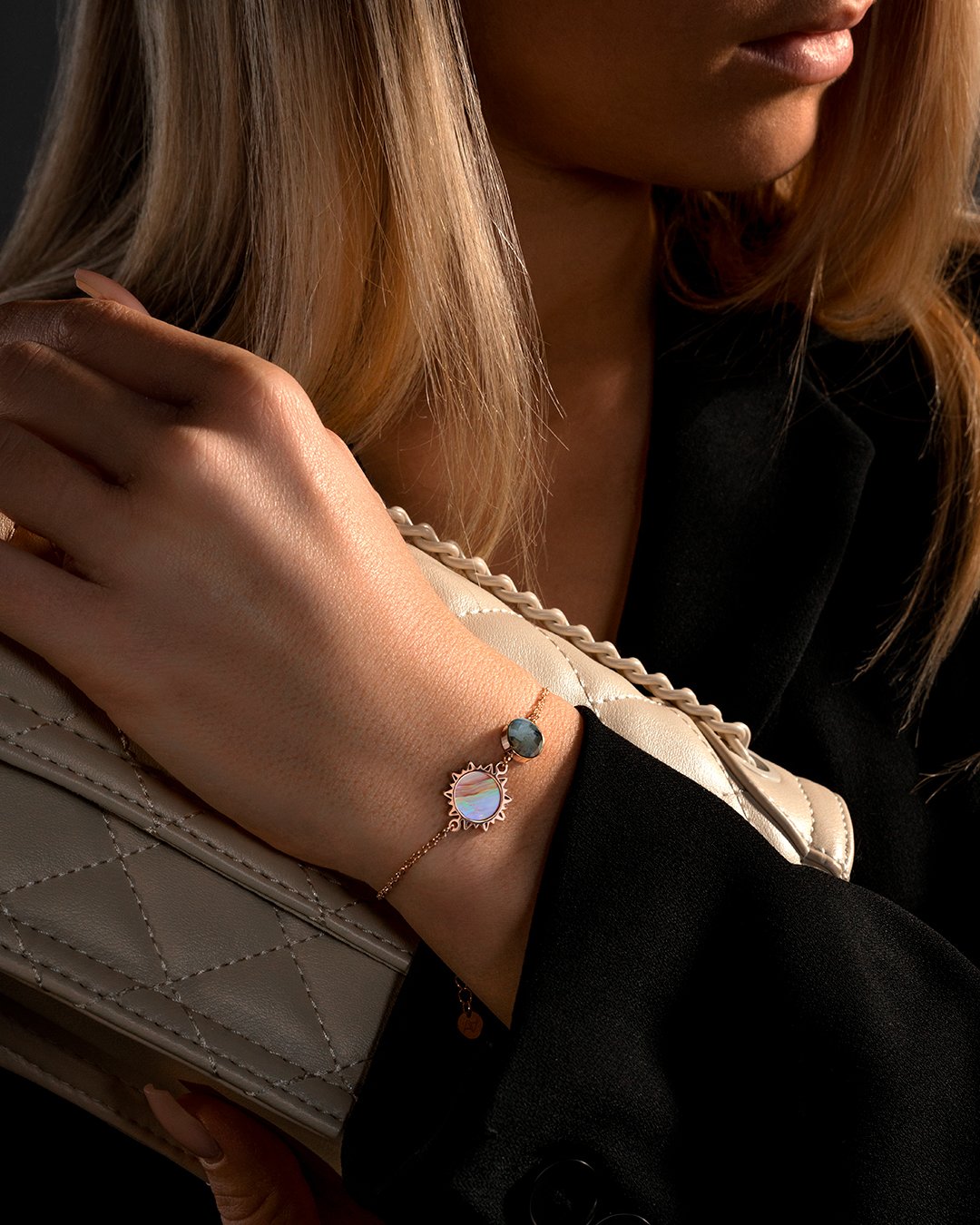 Das Armband Soletti aus roséfarbenem Edelstahl besteht aus einem Perlmuttstück, das von einem Chalzedon begleitet wird.