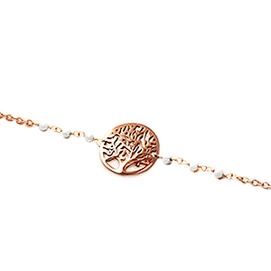 Das Armband Alcati zeichnet sich durch eine elegante Kette aus, die mit sechs kleinen facettierten Howlith-Steinen verziert ist und ein Lebensbaum-Motiv in der Mitte hervorhebt.