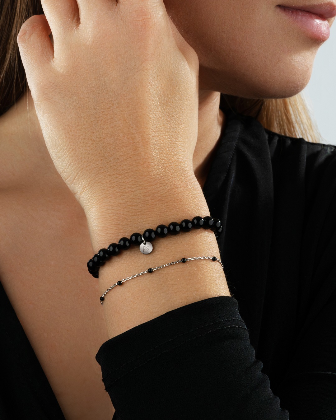 Das Armband Livia besteht aus einer Kette aus Edelstahl, die mit feinen Ornamenten aus schwarzem Emaille verziert ist. Das Armband hat eine Gesamtlänge von 21 cm und besteht aus einem Hauptteil von 14,5 cm sowie einem verstellbaren Teil von 6,5 cm, der an jedes Handgelenk anpasst. Dieses Armband ist ein unverzichtbares Accessoire, das perfekt zu den anderen Armbändern der Marke Anna Velazia passt.