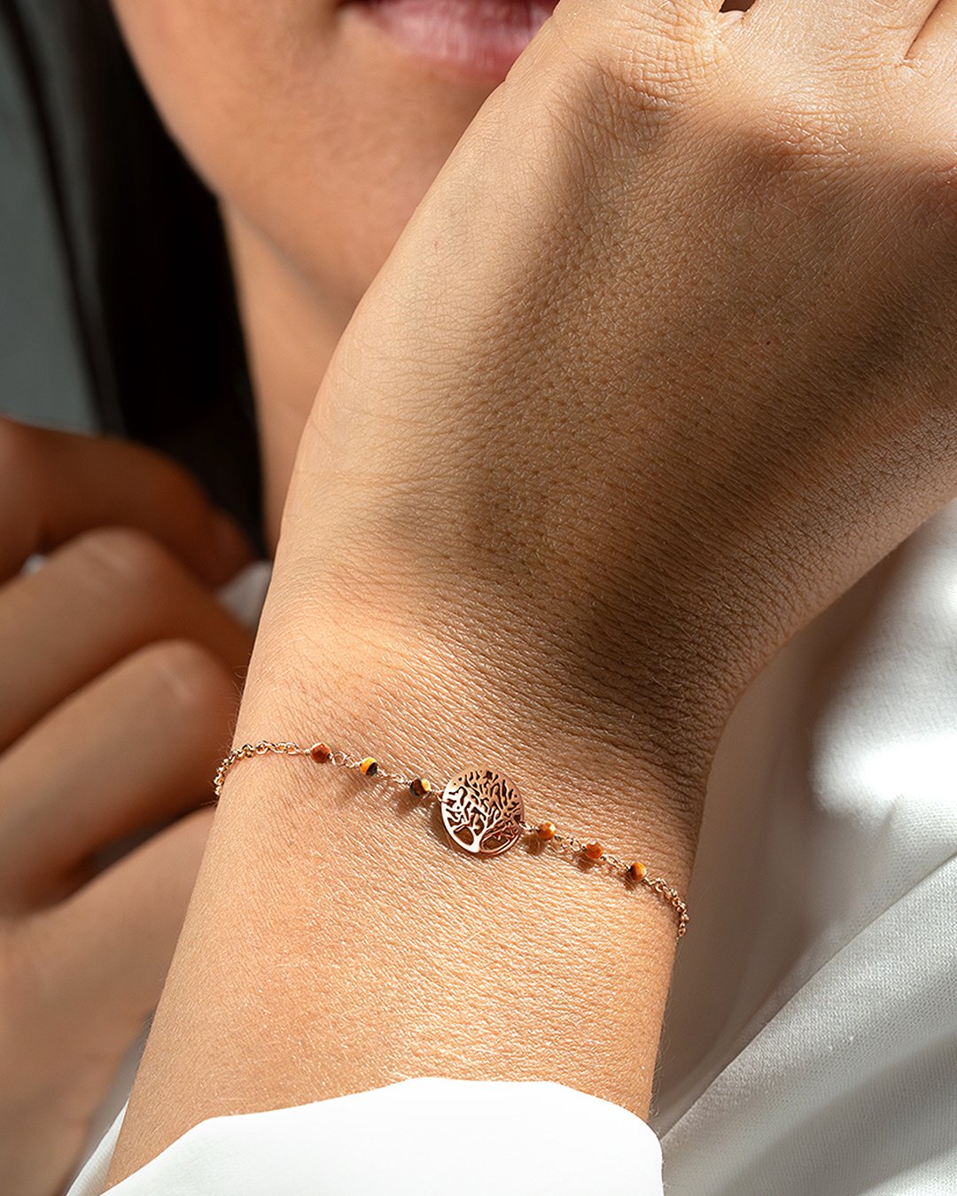 Das Armband Messiti zeichnet sich durch eine elegante Kette aus, die mit sechs kleinen facettierten Tigeraugen-Steinen verziert ist und ein Lebensbaum-Motiv in der Mitte hervorhebt.