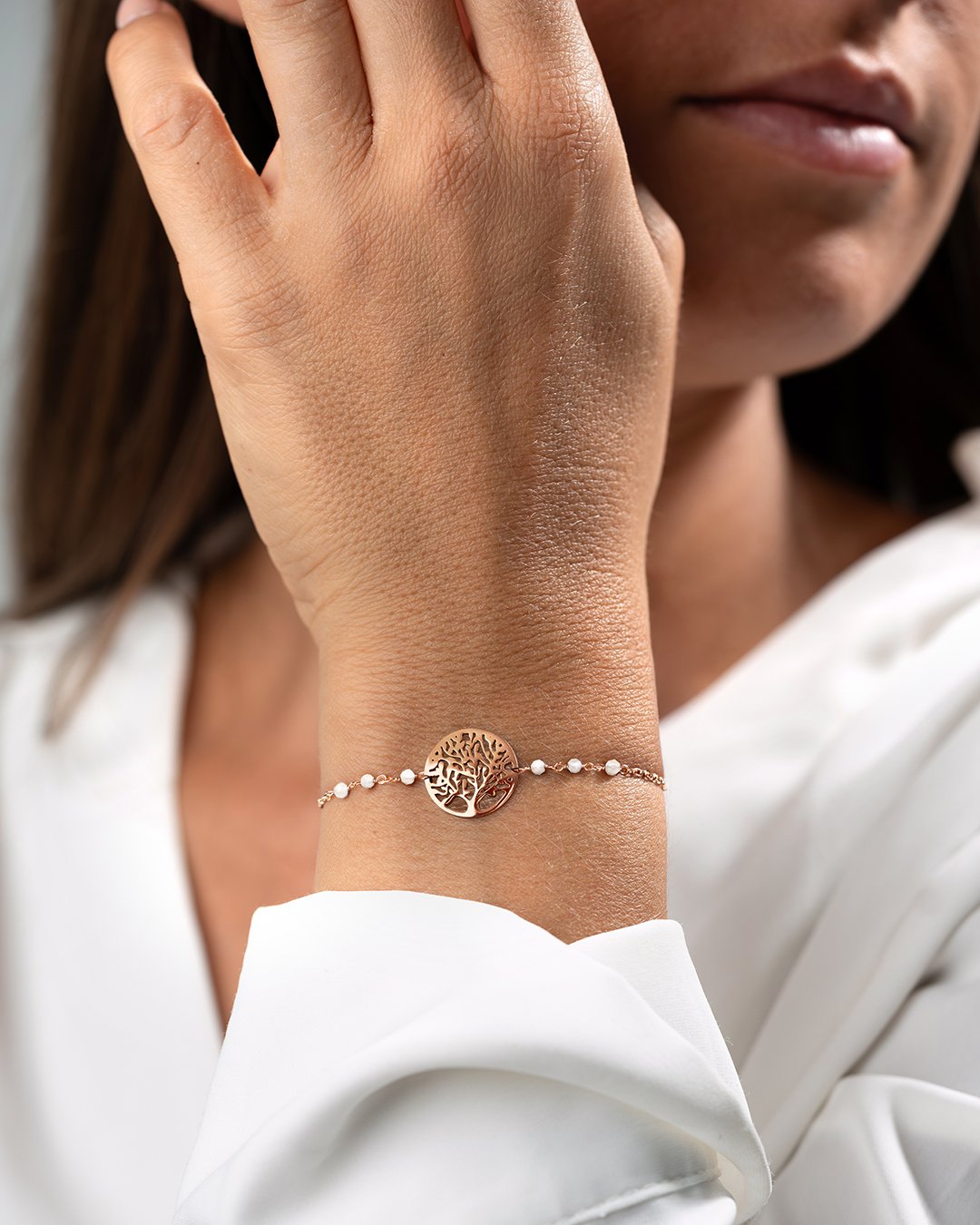 Das Armband Milato zeichnet sich durch eine elegante Kette aus, die mit sechs kleinen facettierten Mondsteinen verziert ist und ein Lebensbaum-Motiv in der Mitte hervorhebt.