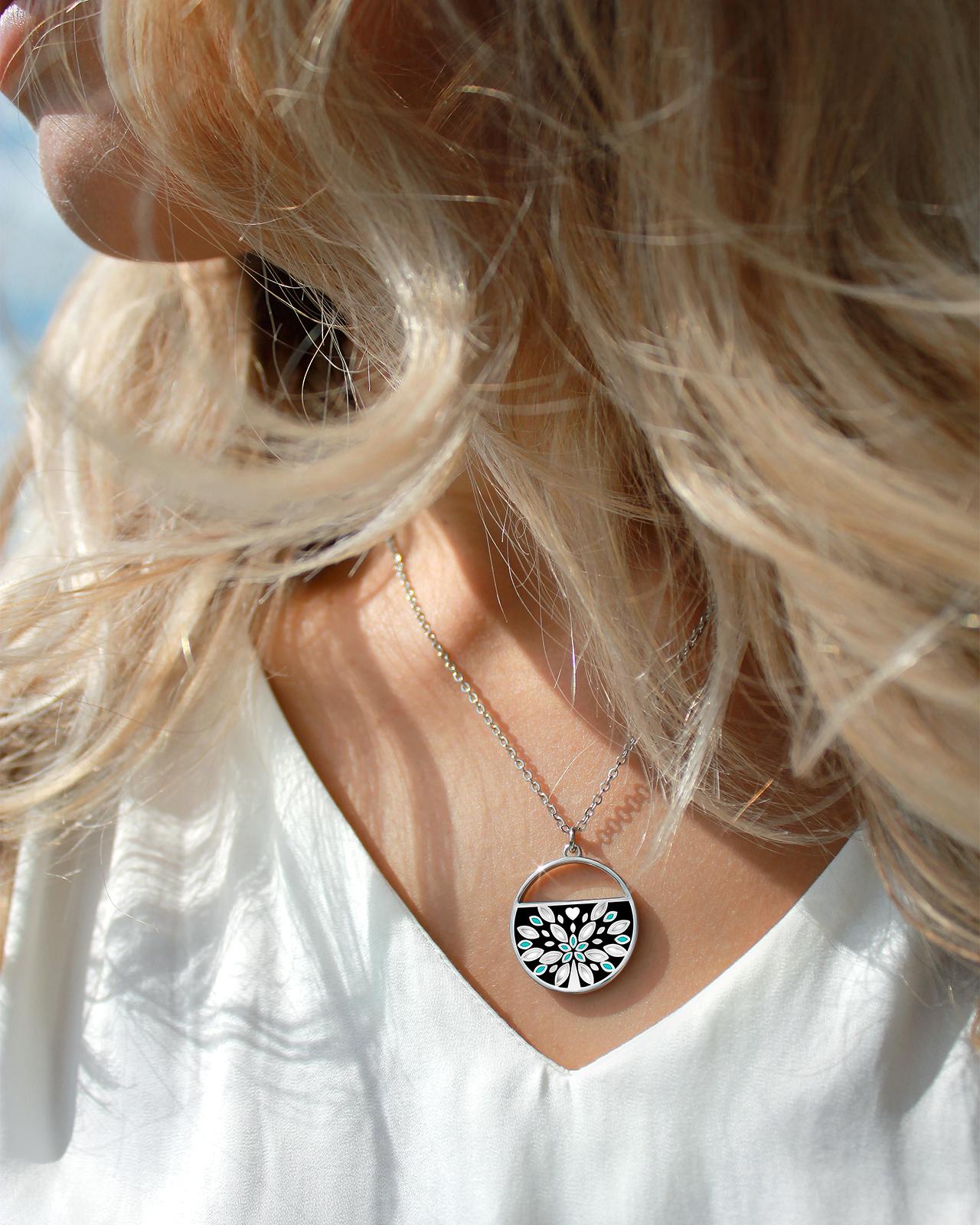 Die feine Stahlkette bringt die ganze Schönheit dieser bedeutungsvollen Emaille zur Geltung.