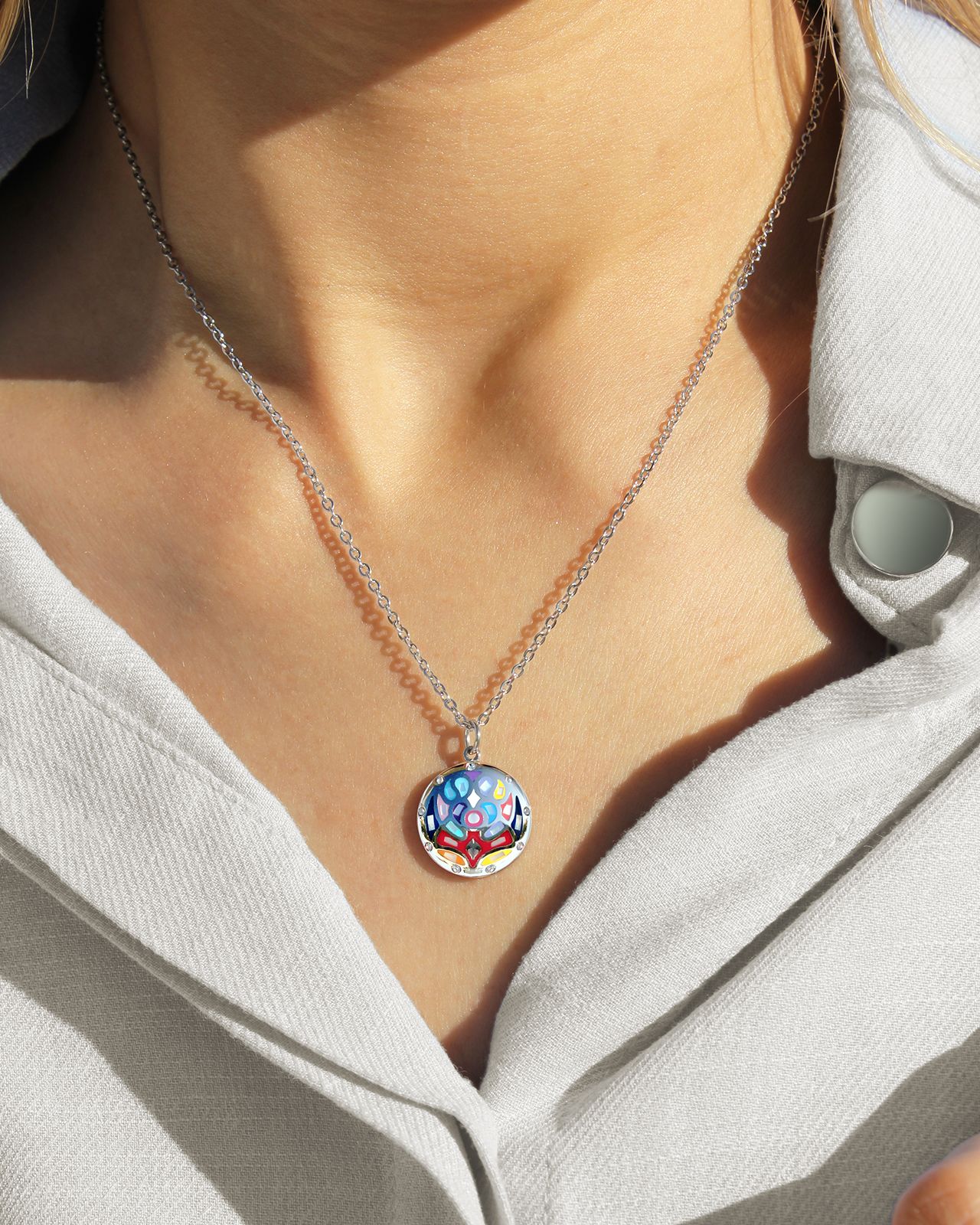 Seine feine Silberkette passt perfekt zu den bunten Motiven von diesem Anhänger.