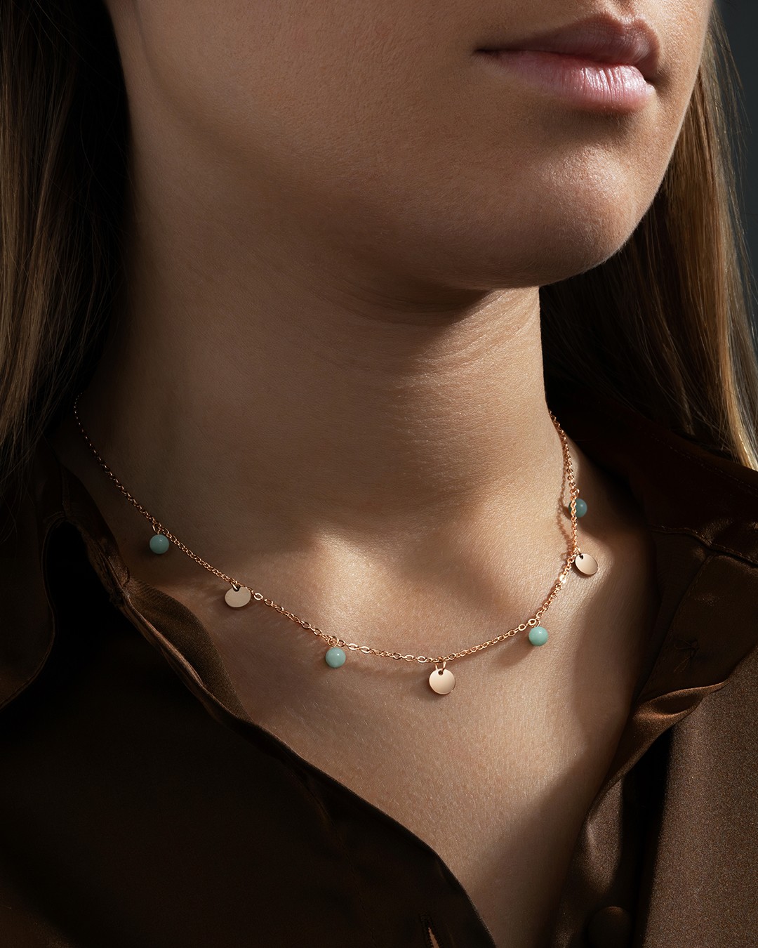 Die Halskette Buranotto ist mit 4 wunderschönen blauen Amazoniten geschmückt, die sorgfältig zwischen den von Anna Velazia signierten Anhängern aus rosévergoldeten Edelstahl angeordnet sind. Mit einer Länge von 48 cm und einem verstellbaren Teil von 6,5 cm passt sich dieses Halsband leicht Ihrem Halsumfang an. In der Steinheilkunde wird Amazonit wegen seiner beruhigenden Wirkung auf die Seele geschätzt. Er soll die innere Harmonie fördern und den Prozess des Vergebens erleichtern. Unsere Schmuckstücke bestehen aus Natursteinen und sind daher alle unterschiedlich. Daher können je nach Modell Unterschiede in Größe und Farbnuancen auftreten. Diese Unterschiede machen jeden Stein einzigartig.