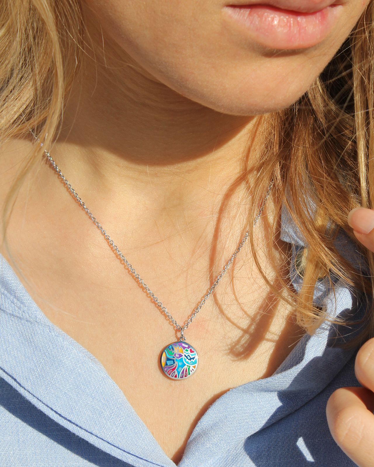 Seine feine und zarte Kette kontrastiert mit den kräftigen Farben seines Medaillons und stellt das perfekte Gleichgewicht wieder her. Seine abgerundete Form bringt die Farben zur Geltung und macht diesen Anhänger raffiniert und unverzichtbar für Ihren Stil.