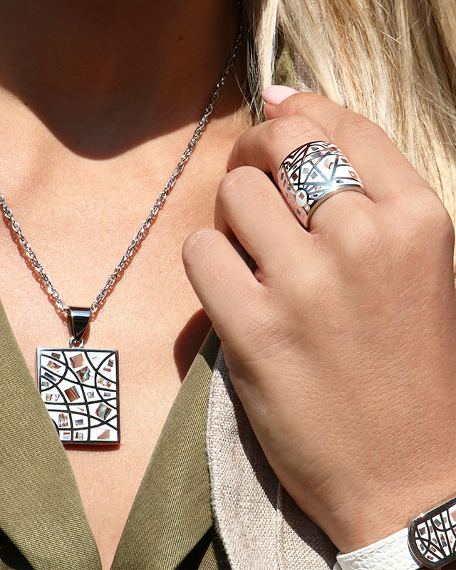 Entdecken Sie die perfekte Mischung aus Emaille und Perlmutt. Eine Kollektion aus einzigartigen Schmuckstücken, deren Zusammensetzung sich an der Schönheit Italiens inspiriert hat.
