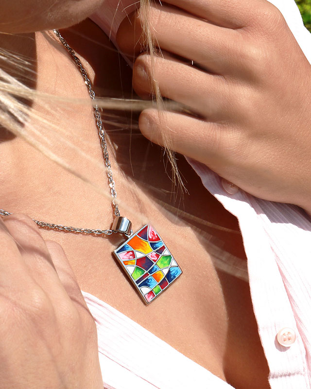 Dieser mit besetzte Edelstein aus emailliertem Stahl ist reich an Farben und Mosaiken, welche die außergewöhnliche Natur und vielen verschiedenen Pflanzenarten darstellen, für die Rivalta berühmt ist. Sie können den Anhänger mit unserem Armband Rivalta kombinieren, das die gleichen bunten Mosaike enthält, um Ihrem Look eine dezente und originelle Note zu verleihen.