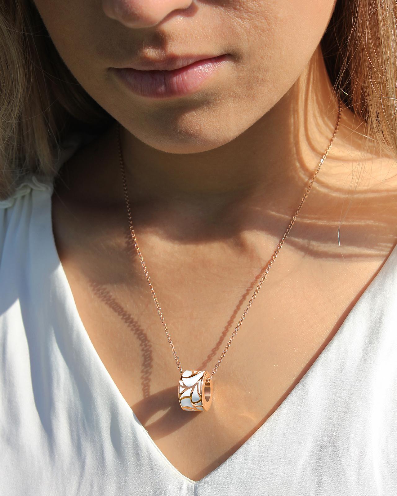Die feine roségoldene Kette wertet das Design auf und sorgt für einen außergewöhnlichen Look.