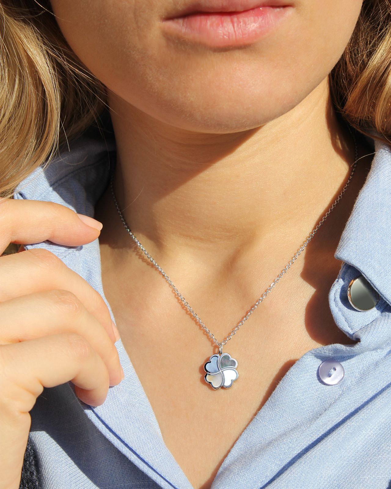 Dieses Schmuckstück in Form eines Kleeblatts findet seine Originalität durch seine verschiedenen Perlmuttschattierungen, die das Schmuckstück schmücken.