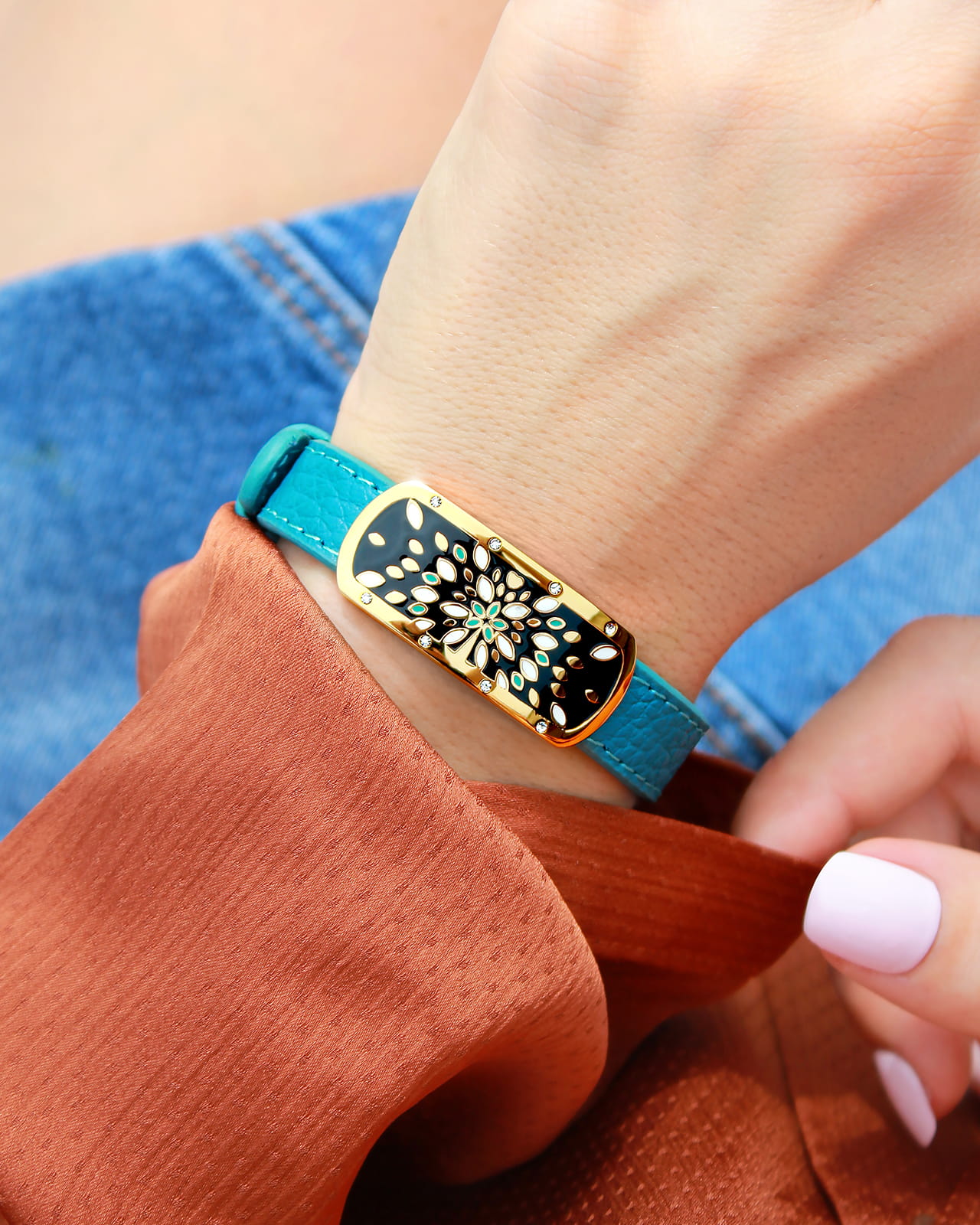 Das türkisblaue Lederband hebt den goldenen Stahl des Schmuckstücks hervor und macht es zu einem trendigen Accessoire.