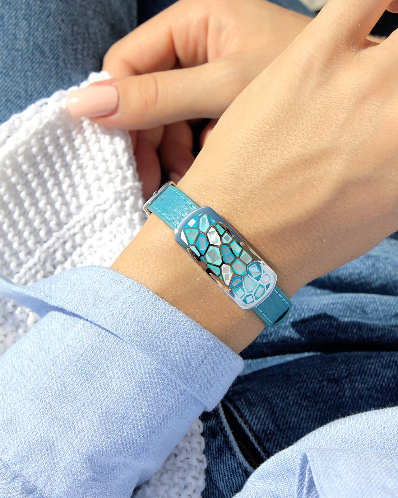 Das Türkisblau seines Lederarmbands bringt die Schönheit dieses Schmuckstücks zur Geltung und verleiht Ihrem Outfit einen farbenfrohen Touch.