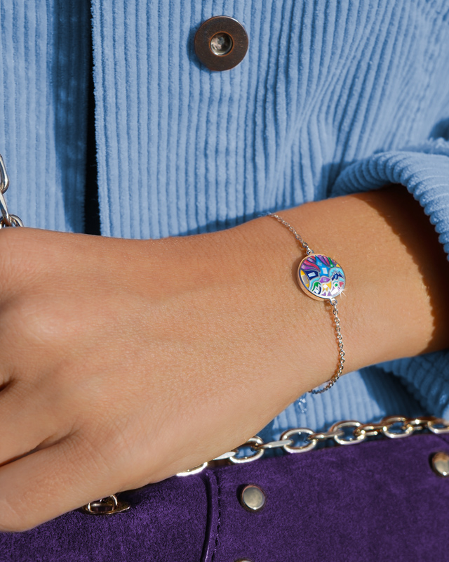 Die bunten Motiven dieses Schmuckstückes und die Anordnung ihrer Mosaike machen es zugleich trendy und originell.