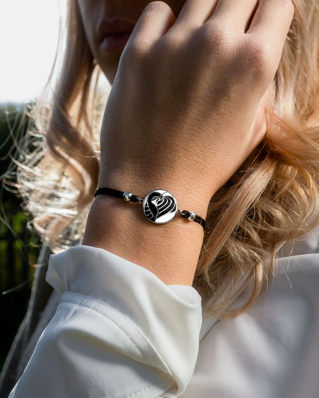 Die schwarze Farbe seines Baumwoll Armbands betont wunderbar die Farbe seines Edelstahls, um so alle Besonderheiten des Medaillons hervorzuheben. Es wird Ihre Outfits diskret betonen.