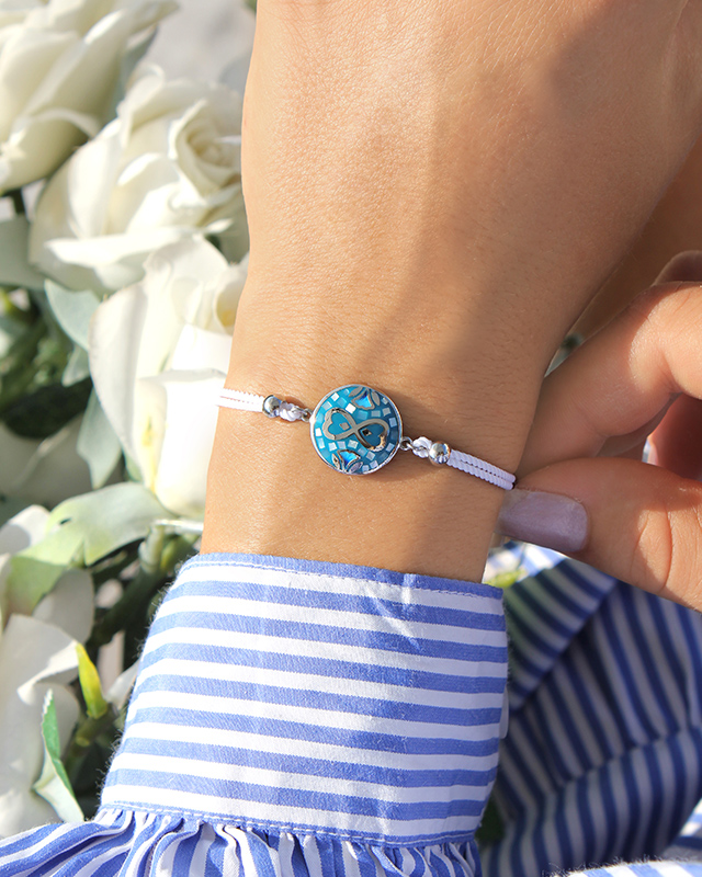 Das weiße Baumwoll-Armband betont die Schönheit seines blaugrünen Emails.