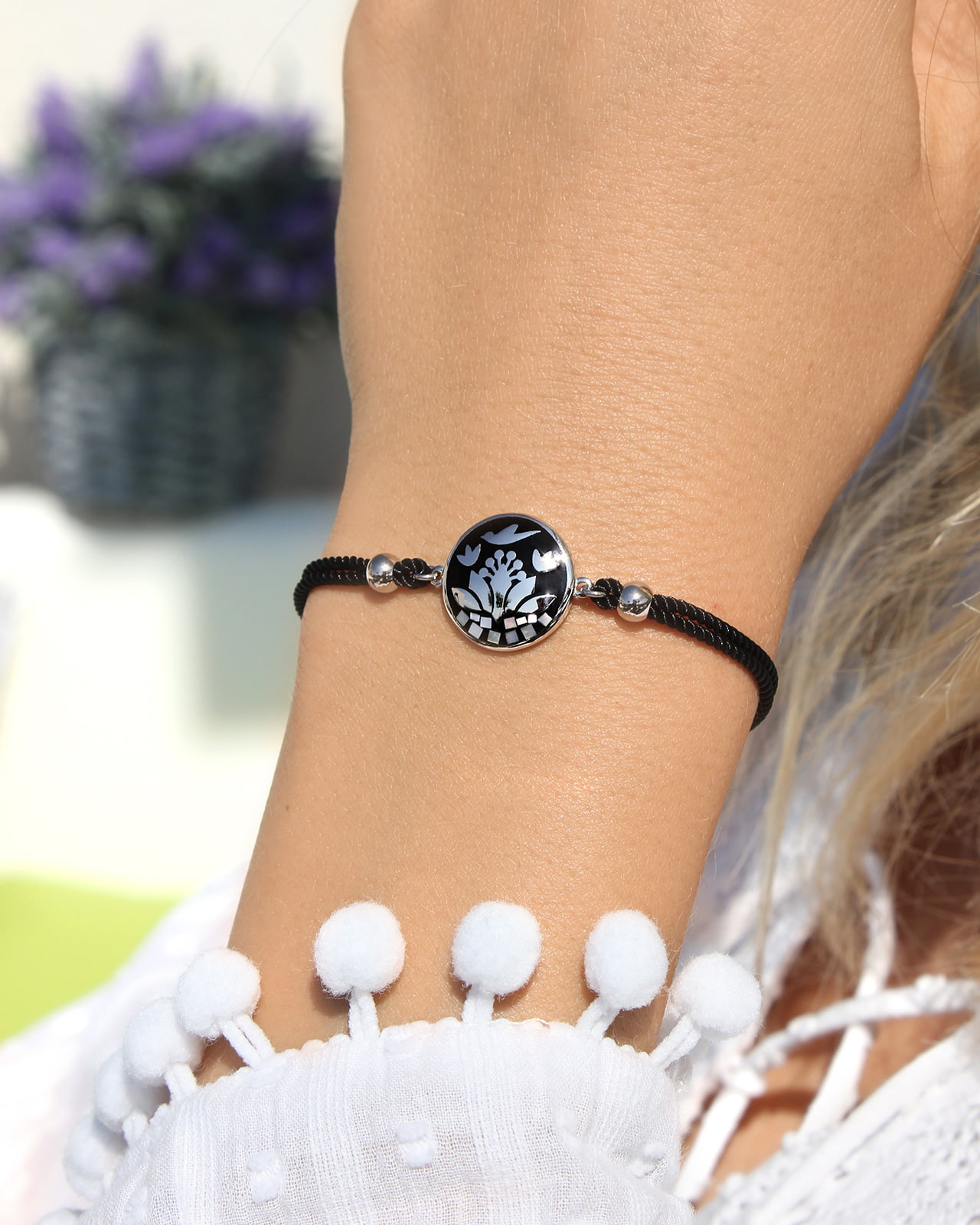Das schwarze Baumwoll-Armband verleihen Ihrem Handgelenk einen Hauch an Eleganz.