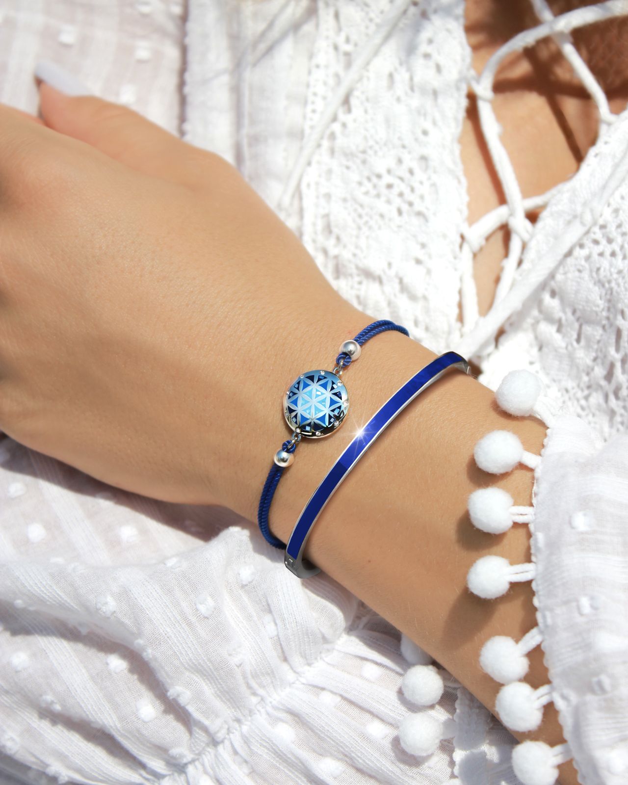 Das marineblaue Baumwoll-Armband betont sanft dieses bedeutungsvolle Schmuckstück.