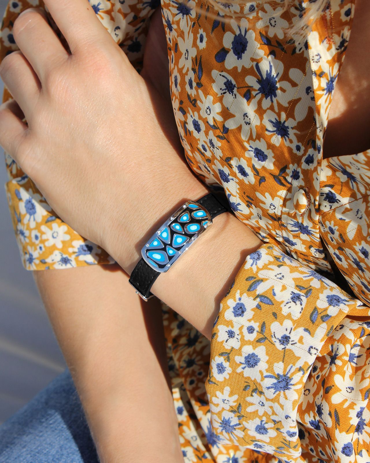 Das schwarze Lederarmband verleiht Ihrem Outfit an Eleganz.