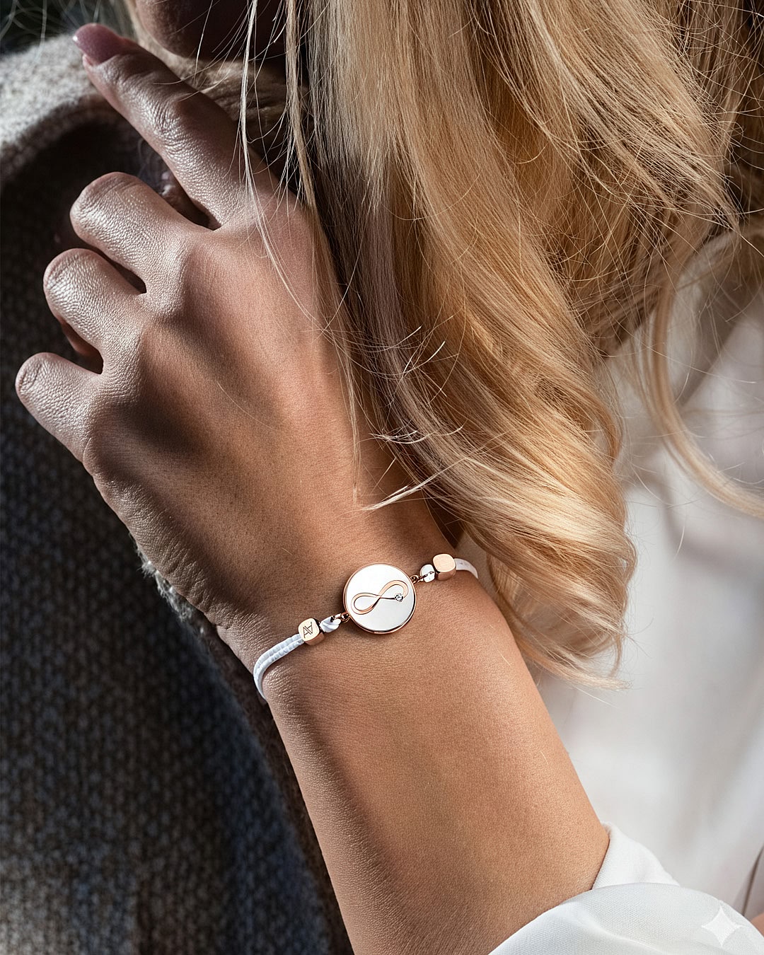 Die weisse Farbe seines Baumwoll Armbands ist der Kontrast zu dem Edelstahl des Motivs, das Ihre täglichen Looks stilvoll hervorhebt.