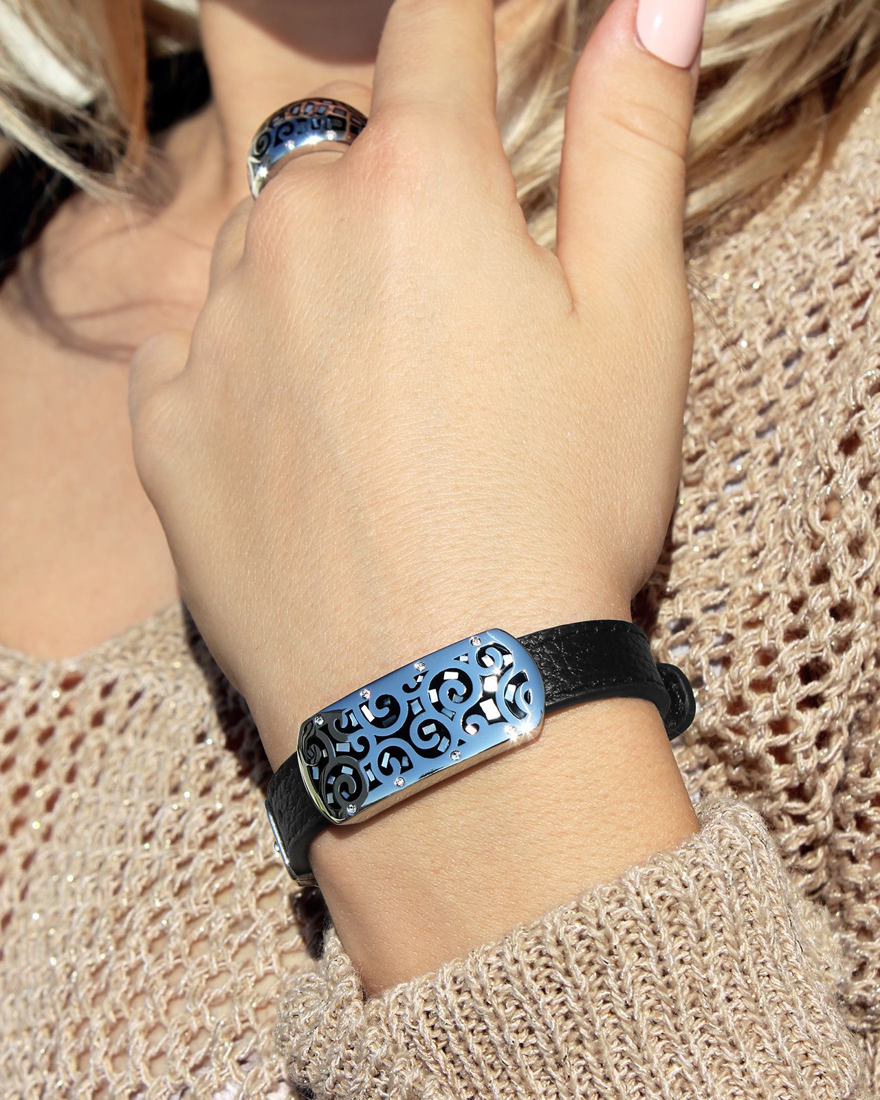 Das schwarze Lederarmband unterstreicht elegant Ihren täglichen Look.