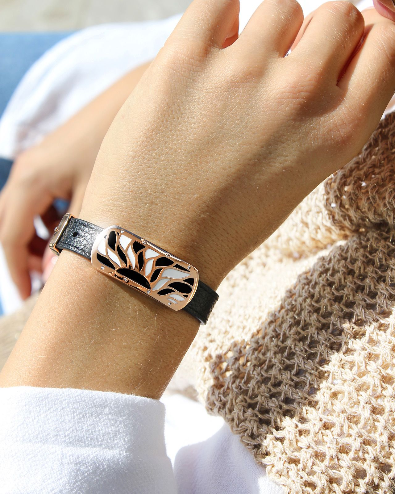 Das Schwarz des Lederarmbands passt perfekt zu jedem Outfit.