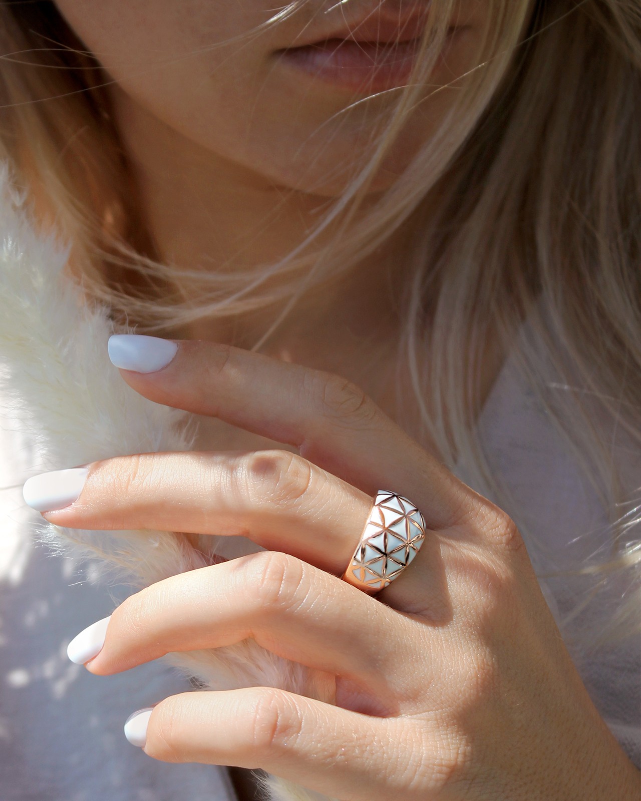 Seine geschwungene Form bringt einen Hauch von Weichheit mit sich, der durch sein leuchtendes Weiß noch verstärkt wird und diesen Ring zu einem Schmuckkästchen voller Eleganz macht.