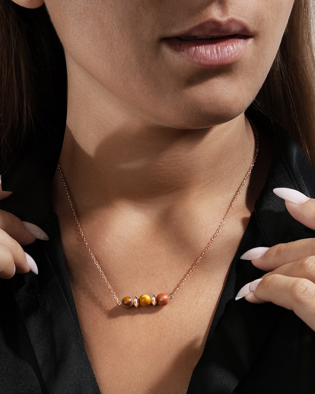 Der Anhänger Bellagina besteht aus 3 Mokait Natursteinen, die sorgfältig zwischen zwei Pastillen aus roséfarbenen Edelstahl