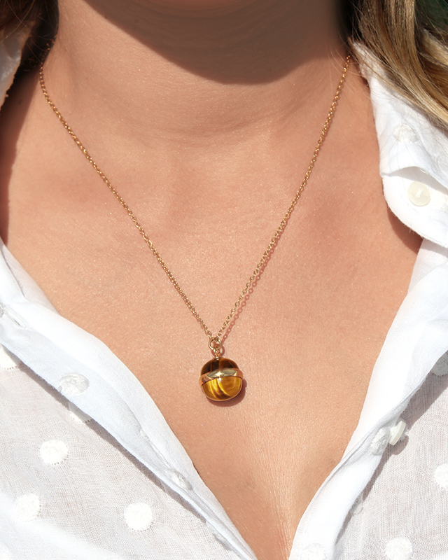 Der Anhänger Lapionio und seine goldene Umrandung heben den einzigartigen Naturstein Tigerauge hervor.