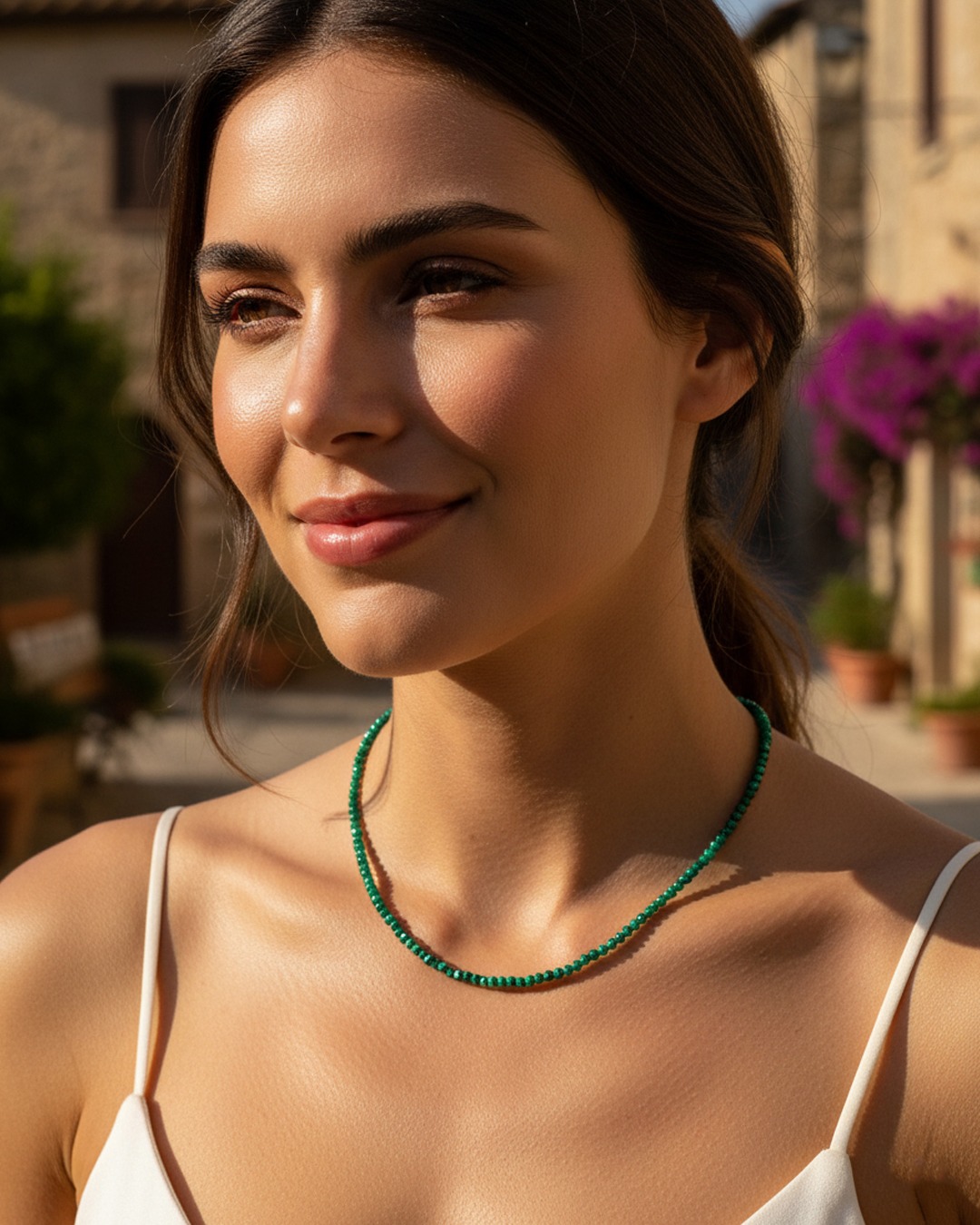 Die Halskette Venola hebt ein zartes Choker-Design hervor, das aus feinen facettierten Malachit-Perlen von 2 mm besteht.