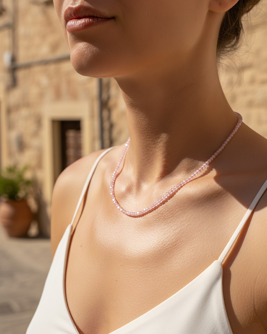 Die Halskette Commia hebt ein zartes Choker-Design hervor, das aus feinen facettierten Rosenquarz-Perlen von 2 mm besteht.