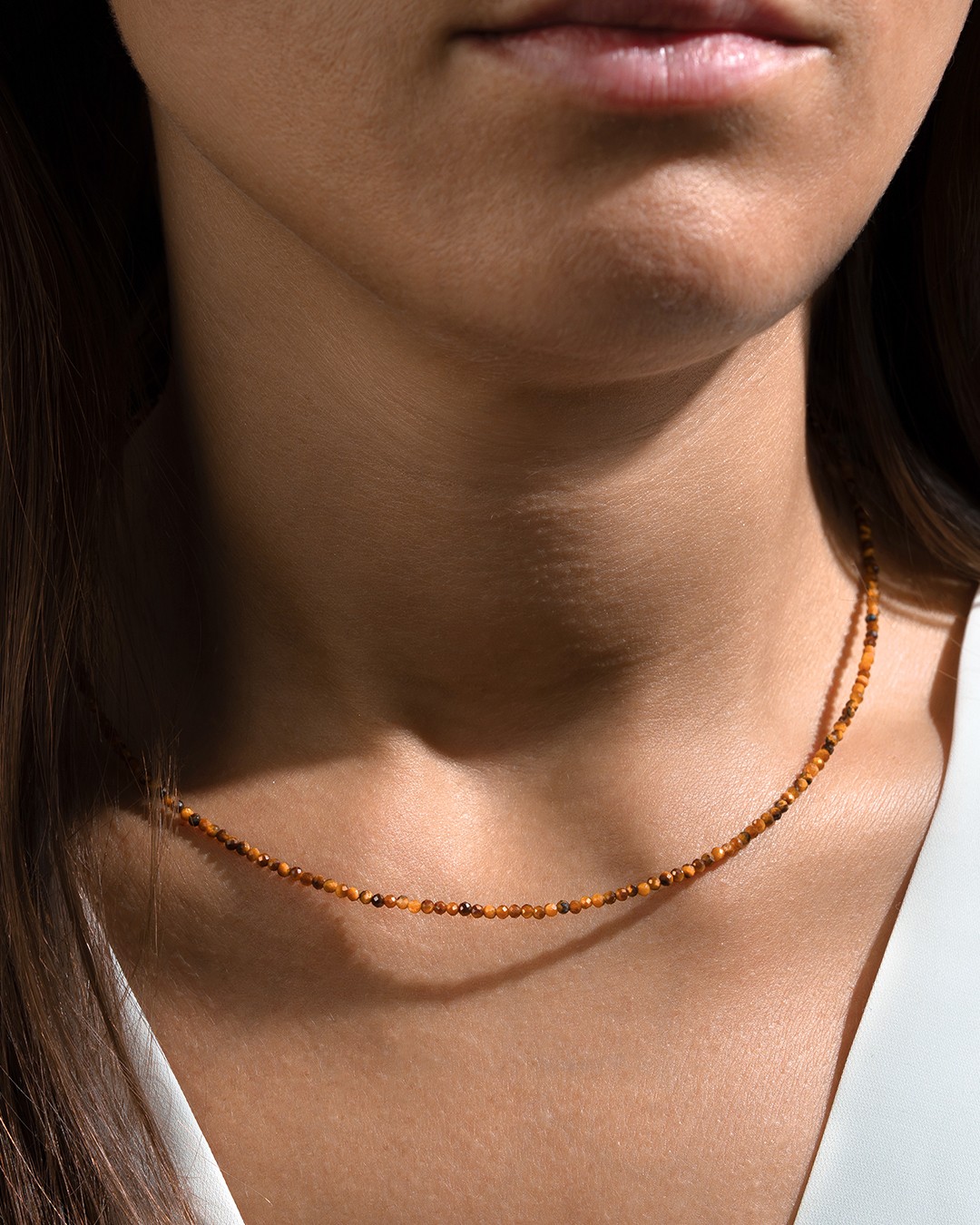 Die Halskette Messi hebt ein zartes Choker-Design hervor, das aus feinen facettierten Tigerauge-Perlen von 2 mm besteht.