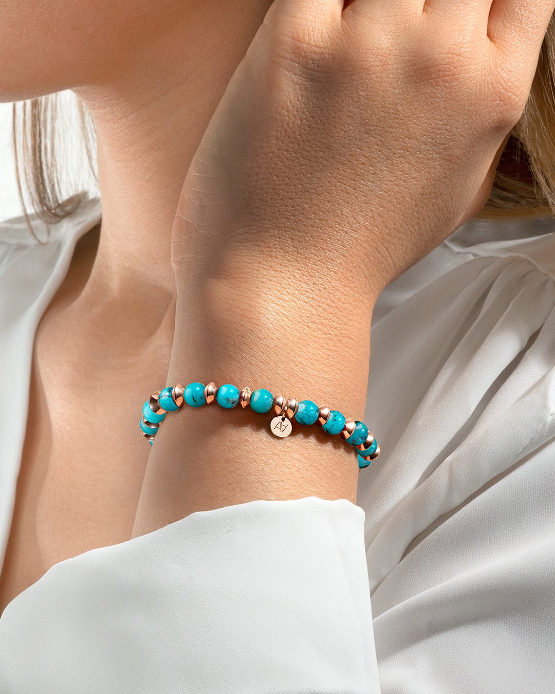 Das Armband Atrania ist aus wunderschönen Türkisen gefertigt. Das Herzstück ist ein von Anna Velazia entworfenes Plättchen aus rosévergoldetem Edelstahl, das Ihrem Handgelenk einen Hauch von Farbe verleiht. In der Lithotherapie ist der Türkis für seine harmonisierenden, schützenden und kommunikationsfördernden Eigenschaften bekannt. Unsere Schmuckstücke bestehen aus natürlichen Steinen, die alle unterschiedlich sind. Daher kann es je nach Modell zu Abweichungen in der Größe und den Farbnuancen kommen. Es sind diese Unterschiede, die jeden Stein einzigartig machen. Die Anzahl der Steine kann von einem Armband zum anderen variieren.