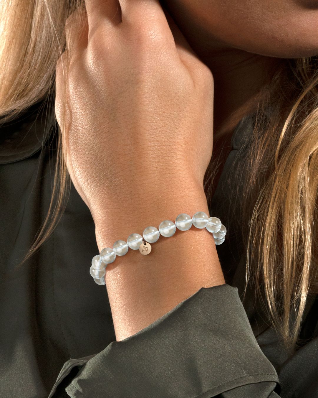 Das Armband Piemonte ist aus Bergkristall gefertigt und besteht aus 8 mm großen Natursteinen, die mit einer von Anna Velazia signierten Pastille verziert sind. Die Pastille ist aus rosévergoldetem Edelstahl gefertigt.
