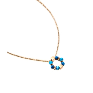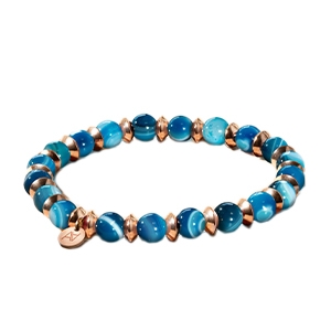 Das Armband Azzurra besteht aus einer zarten rosévergoldeten Edelstahlkette, die in der Mitte von einem floralen Motiv aus blauem Achat veredelt wird, verflochten mit einem gehämmerten Ring aus roséfarbenem Edelstahl.