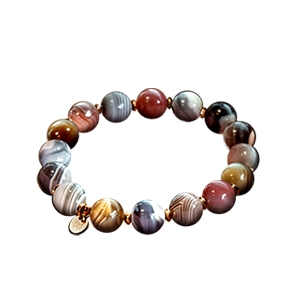 Das Armband Avellina ist aus Botswana-Achat gefertigt. Das Armband besteht aus 8 mm großen Natursteinen und ist mit einer von Anna Velazia signierten Pastille verziert. Die Pastille ist aus rosévergoldetem Edelstahl.